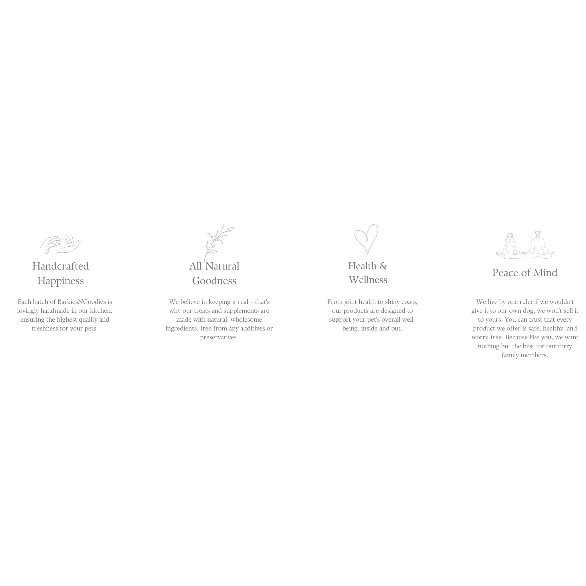 At BarkiesNGoodies, our mission is more than just words – it's our guiding light, our reason for being. Our goal is clear: to provide pet parents like yourself with premium-quality products that prioritize the health and happiness of your furry family members. With BarkiesNGoodies, you can trust that every treat and supplement is made with natural, organic ingredients and crafted with the same level of care and attention that we give to our own pets. We promise to never compromise on quality, ensuring that every small-batch, handmade goodie is worry-free and safe for your furbabies to enjoy.